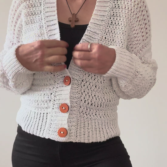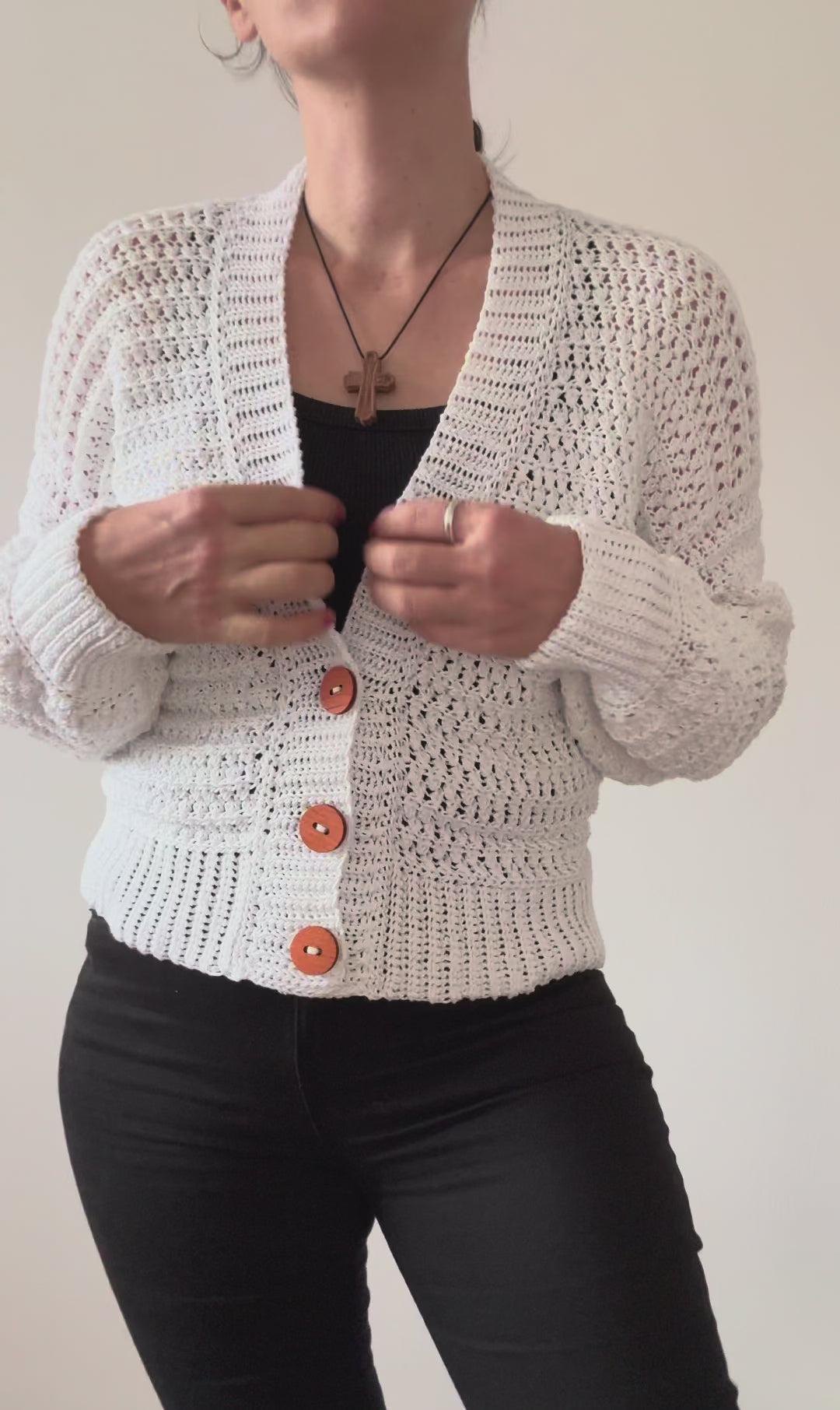 Aria is a soft cozy cardigan made with a beautiful and simple crochet stitch. It has a slightly oversized fit and a dropped shoulder construction, details that give an excellent fit to all body types. Aria Cardigan is worked bottom up in one piece in back-and-forth rows. The sleeves are crocheted directly onto the body and likewise worked in back-and-forth rows with turning. Ribbing is worked in the front edge.