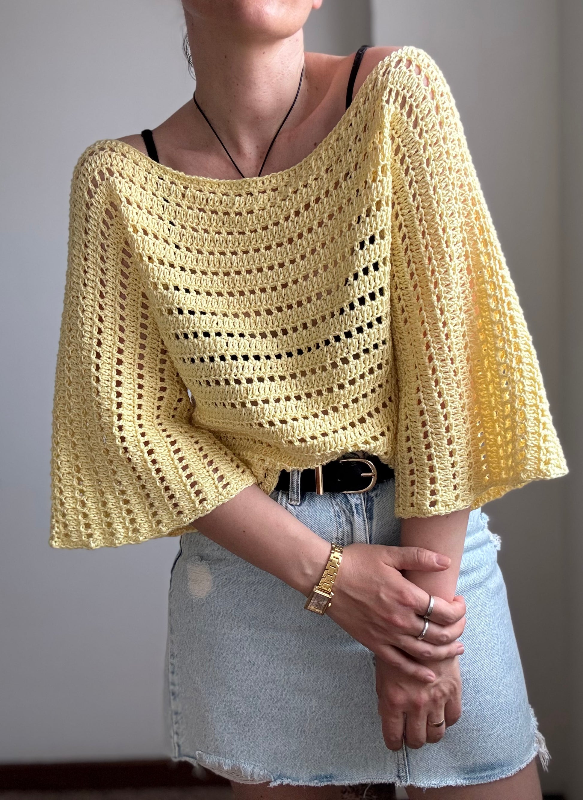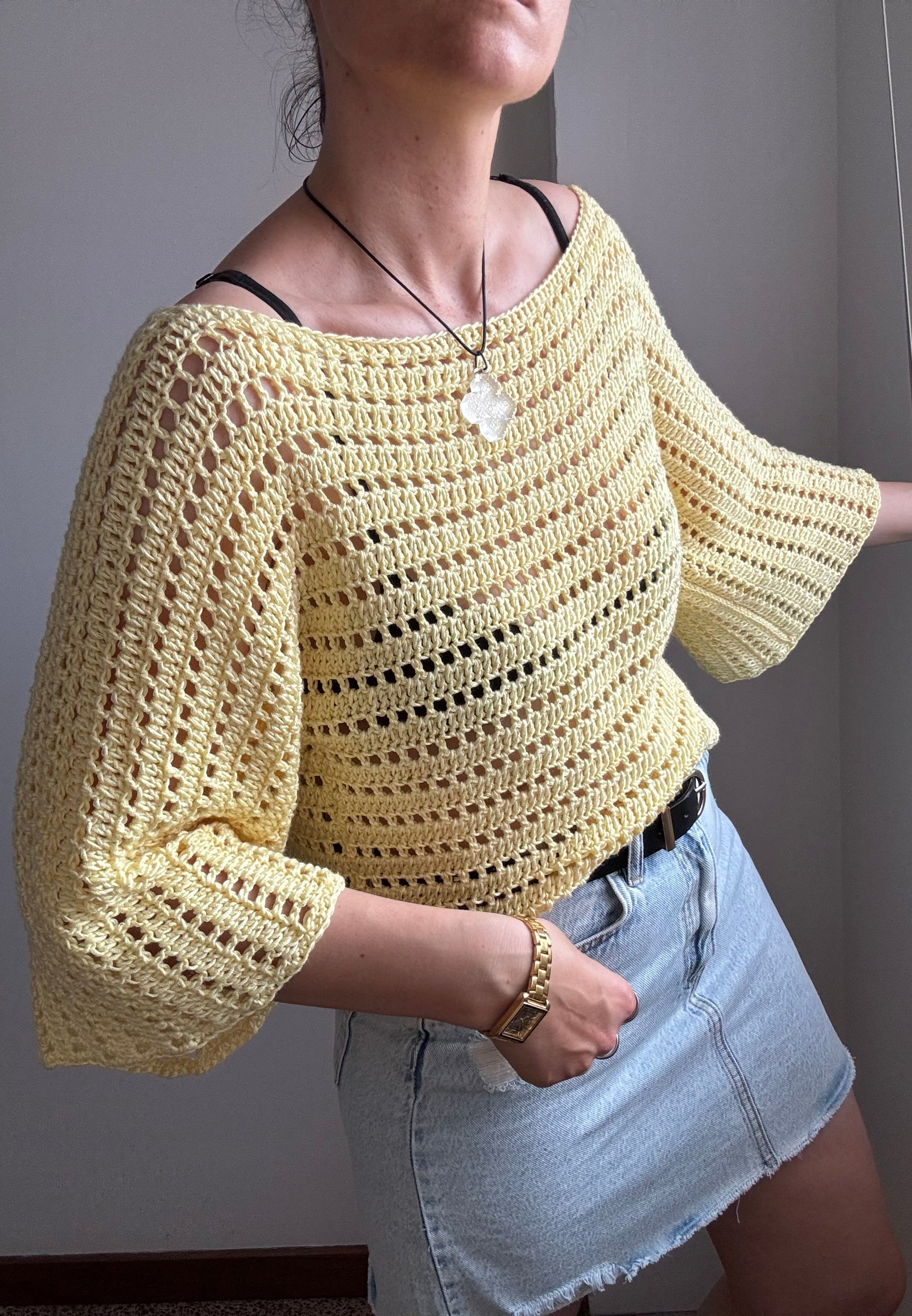 Il Thea top giallo è lavorato con il cotone Eco Soft Bio di Mondial (50gr/125m)